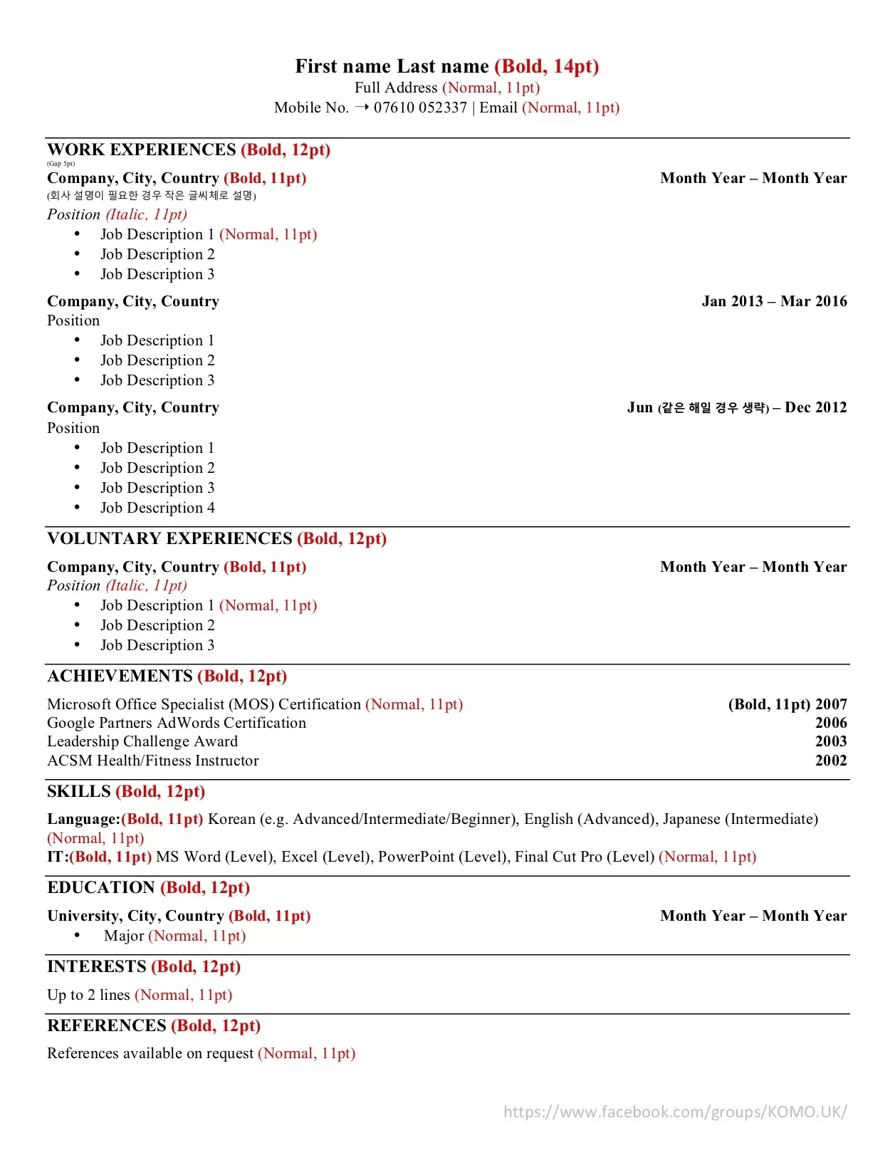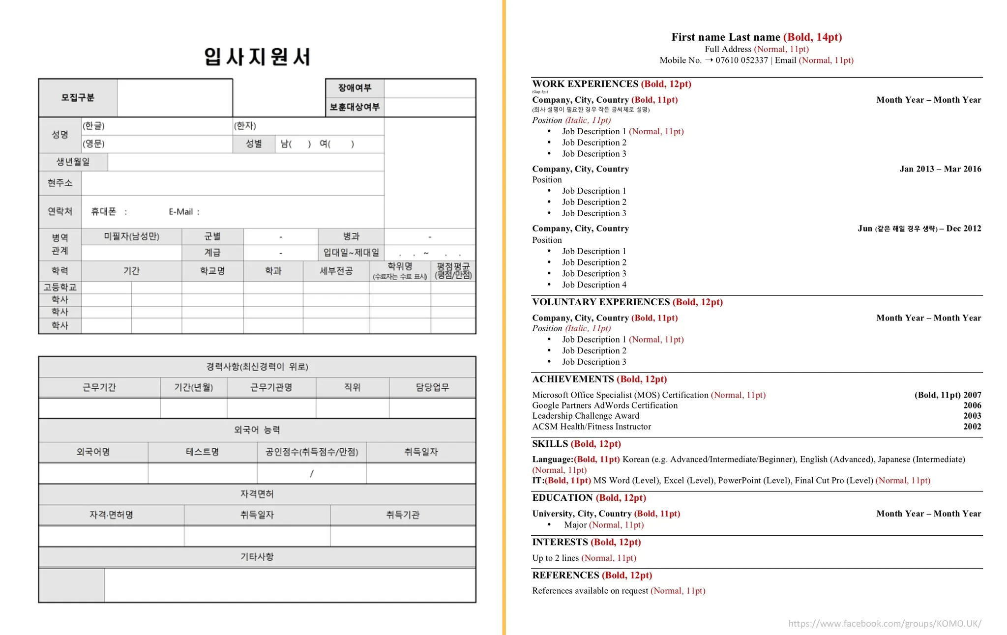 영국 내 일부 회사의 경우 온/오프라인 양식이 지정되어 있으나, 지정된 양식이 없는 곳이 대부분입니다. 주로 영문이력서 관련 문의를 하시는 분들은 한국에서 구직 활동을 통하여 국문이력서에 익숙하기에 영문이력서 작성 시 막막함을 느끼시는 것으로 보입니다.