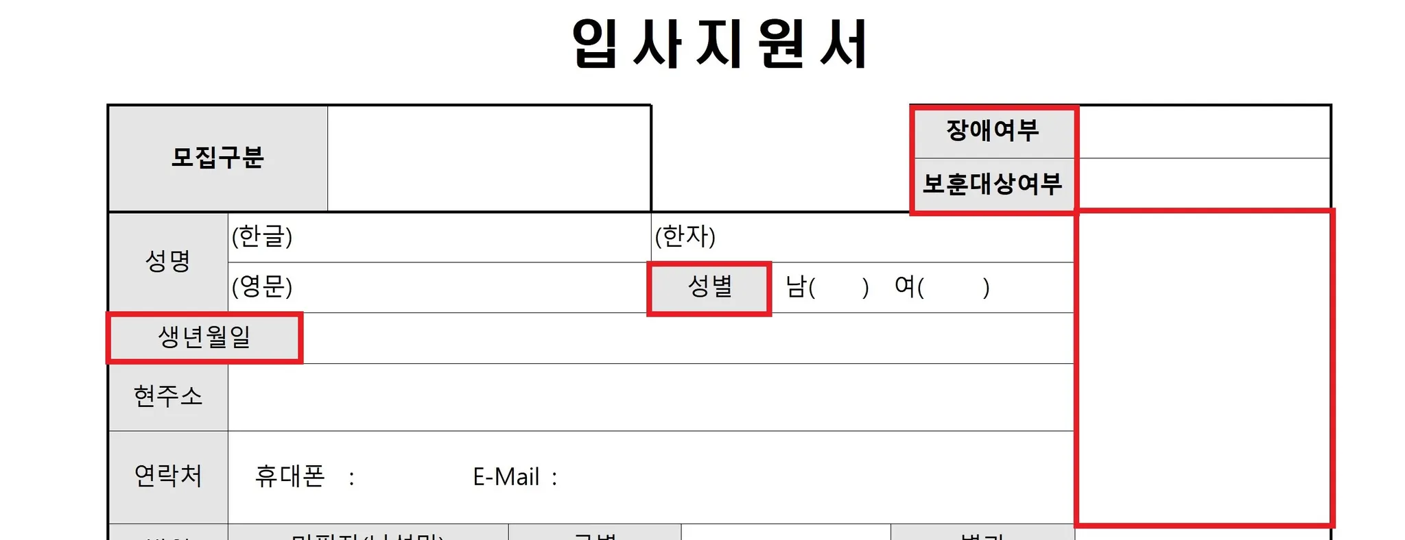2010년 평등법 (Equality Act 2010) 에 따라 아래 사진의 빨간 네모로 표시된 것 외에도 국적, 나이, 종교, 혼인 혹은 자녀 여부 같은 차별이 가능한, 또는 할 수 있는 개인 정보는 이력서에도 면접에서도 기재 혹은 답변 할 의무는 없습니다.