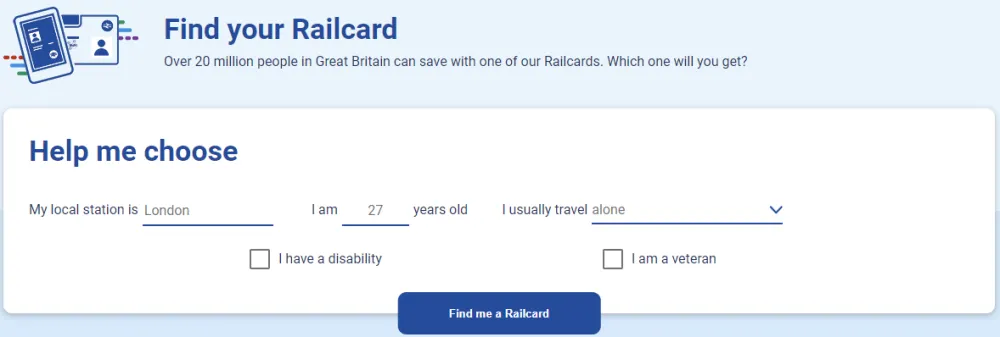영국에는 다양한 나이대에 신청하여 교통비를 할일 받을 수 있는 Railcard가 있습니다. 어떤 것이 가능한지 잘 모른다면 웹사이트를 통해 아래와 같은 간단한 폼을 작성하면,