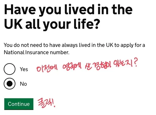 최근에 영국으로 왔다면 No를 고른 후 Continue를 클릭하여 다음 단계로 진행합니다.