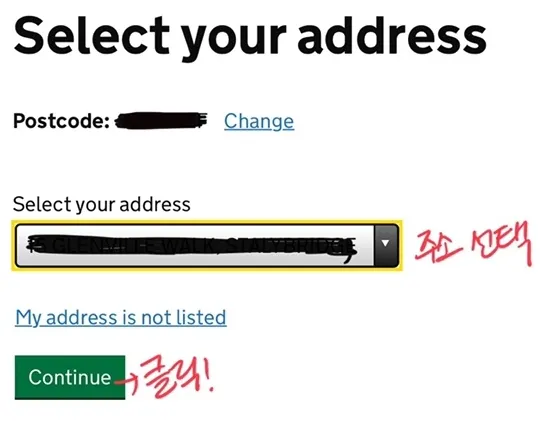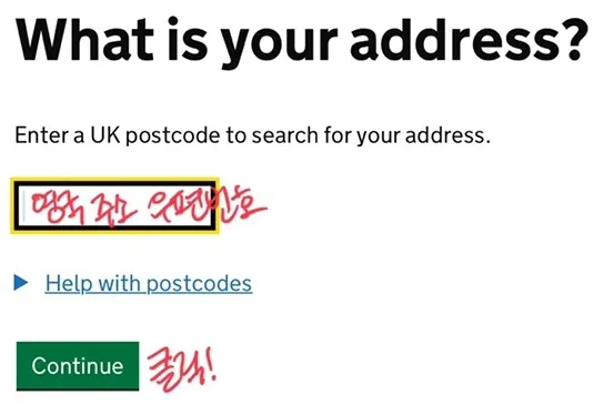 현재 살고 있는 영국 주소의 우편번호(예:SW10 9AH) 입력 후 Continue를 클릭하여 다음 단계로 진행합니다.