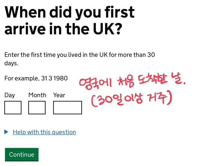 영국에 처음 도착한 날짜를 적은 후 Continue를 클릭하여 다음 단계로 진행합니다.