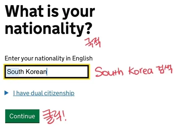 국적을 적을 땐 South Korea를 적으면 아래와 같이 찾을 수 있습니다. 후에 Continue를 클릭하여 다음 단계로 진행합니다.