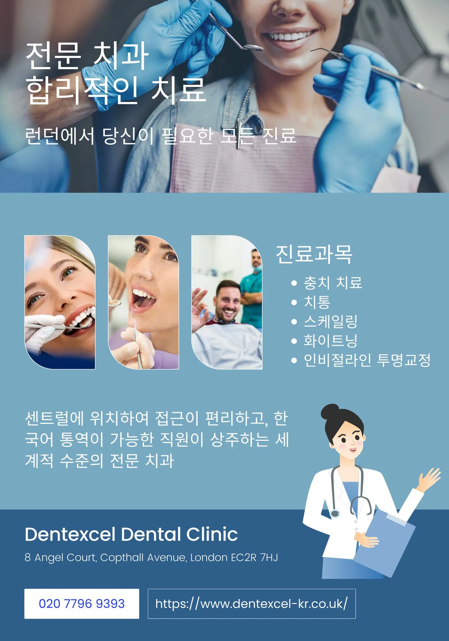 당신의 아름다운 미소를 책임질 치과 ‘Dentexcel’ 입니다. ‘Dentexcel’은 20년 이상의 경력과 3개의 지점을 가지고 있는 영국을 주도하는 치과 중 하나입니다. 저희 ‘Dentexcel’에서는 친절한 한국인 치과 간호사가 통역을 도와드릴 것입니다.