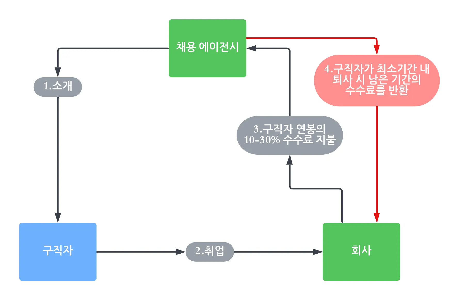 ③ 회사가 채용 에이전시에 구직자 연봉 기준 평균 약10~30%의 수수료를 지불합니다.