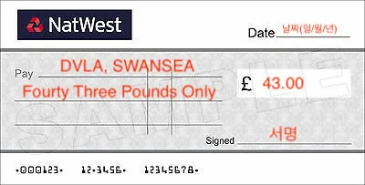 £43 Cheque 또는 Postal Order (2022년 1월 7일 기준 비용)